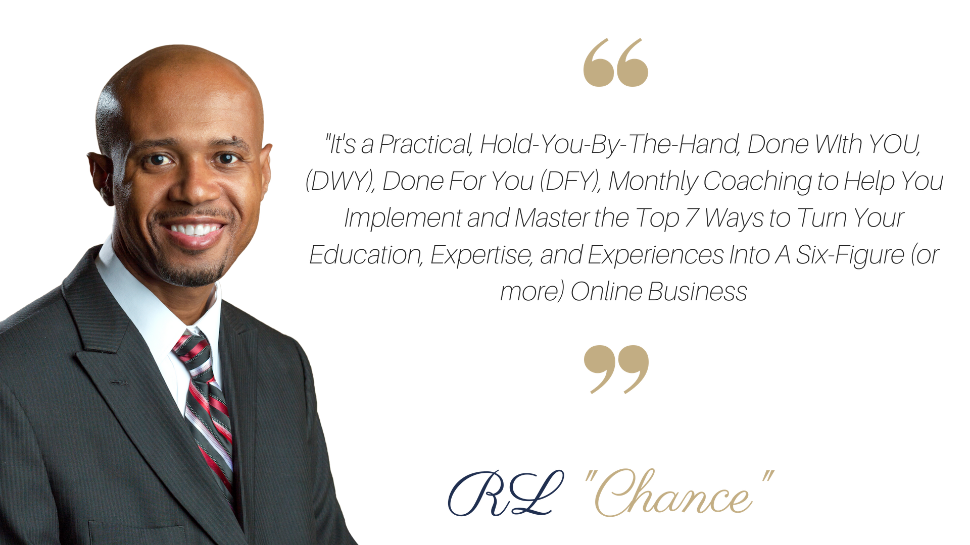 RL Chance is a US Navy veteran, eight-time #1 Bestselling Author®, speaker, minister, and implementation strategist. He helps professionals, entrepreneurs, authors, speakers, coaches, consultants, ministry leaders, managers, educators, and veterans to monetize their skills so they can make a lasting impact and sustain their mission, message, or cause.